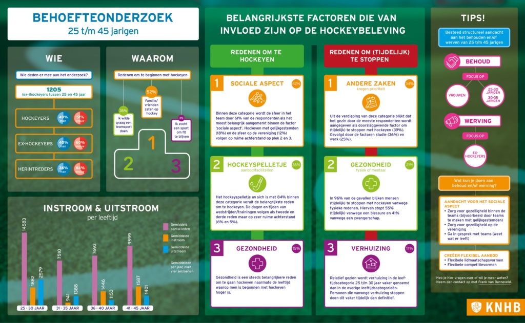 Een aantal jaar geleden (2016) is, in samenwerking met VODW, al onderzoek gedaan naar de factoren die van invloed zijn op de uitstroom van hockeyers tussen de 18 en 25 jaar en hockeyers tussen de 35 en 45 jaar. Om verder inzicht te krijgen hebben we in 2019 een vervolgonderzoek uitgevoerd. Hierbij is de onderzoeksdoelgroep uitgebreid naar 25 t/m 45 jaar én keken we niet alleen naar de factoren die van invloed zijn op de uitstroom maar juist ook naar de factoren die bepalend zijn voor het blijven hockeyen en/of weer gaan hockeyen.