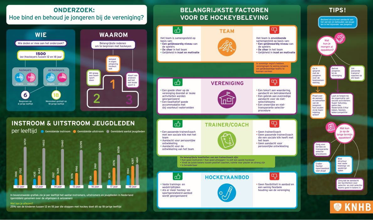 Bij de KNHB hebben we als doelstelling om een leven lang hockey aan te bieden. Bij leden in de leeftijd van 12 tot 18 jaar zien we echter een grote uitstroom. Vanaf 12 jaar haken er al meer kinderen af dan dat er bij komen, en de grootste piek van afhakende jeugd ligt bij 18 jaar. Waar ligt dit aan? En wat maakt dat kinderen wél blijven hockeyen? Om hier meer inzicht in te krijgen, hielden we een onderzoek onder de A-, B- en C-jeugd. De resultaten uit dit onderzoek onder jongeren staan op deze pagina.