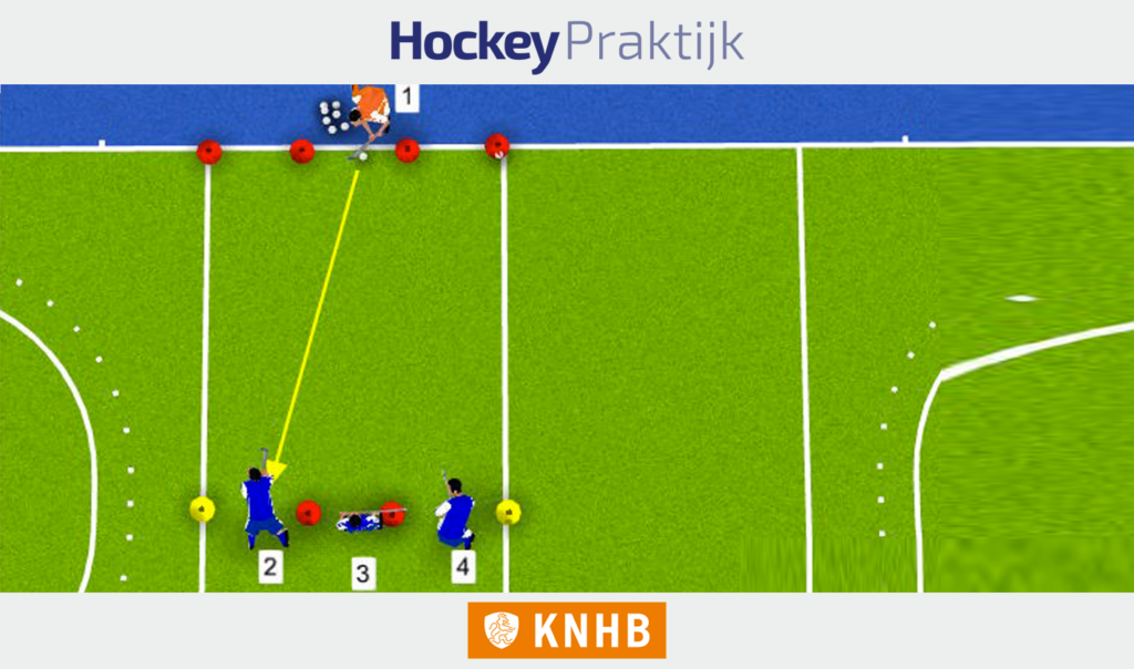 • Blauw 2, 3, 4 proberen te scoren in de 2 goals op de achterlijn.