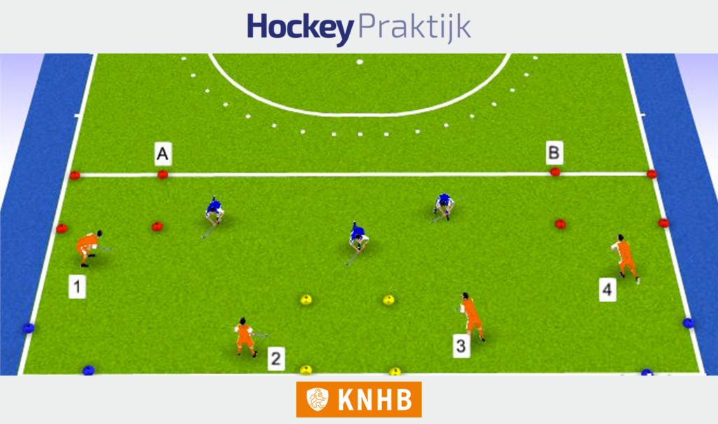 • De drie oranje spelers moeten door goed positiespel en juiste druk scoren voorkomen.