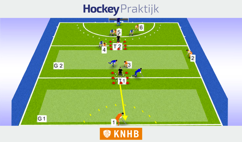 • De trainer (T1) gooit/slaat de bal op oranje 1, 2 of 3. Zij moeten samen met oranje 4, 5 en 6 proberen te scoren.