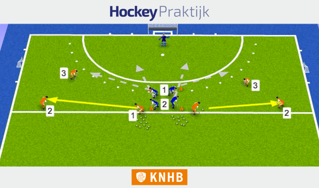 • Oranje 1, 2 en 3 (eventueel 4) proberen te scoren in de goal.
