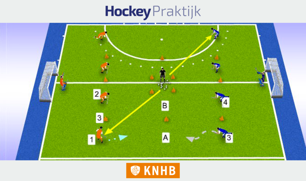 • Train het omschakelen bij 2:2: als blauw 3 de bal afpakt speelt hij blauw 4 (vak B) in; ze spelen in dat vak 2:2 tegen oranje 1 en 2.