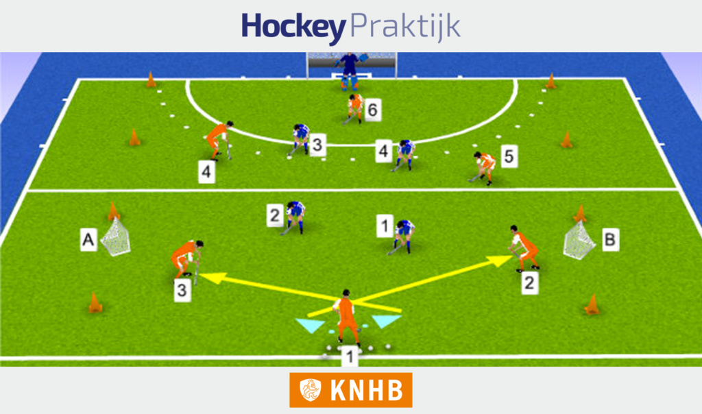 • Spelersaantal wisselen: oranje met 5 spelers tegen blauw met 3 plus keeper.