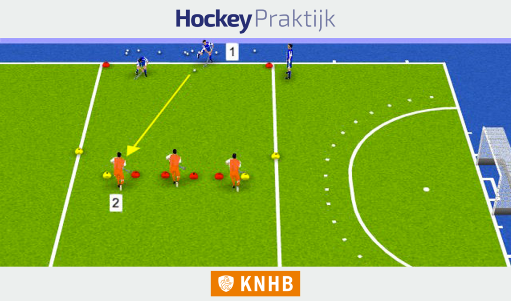 • De 2 verdedigers van blauw proberen dat te voorkomen en mogen zelf scoren in de gele doelen (2 meter breed) na het veroveren van de bal. Zij mogen van iedere afstand scoren.