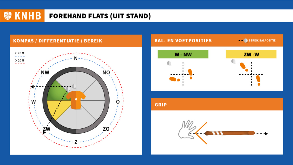 push (uit stand) wordt gebruikt voor afstanden tot 20 meter, terwijl een forehand flats over
