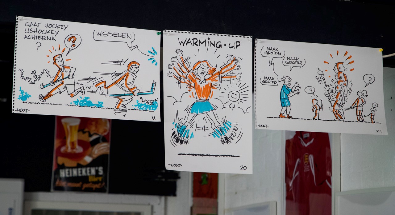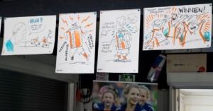 Tijdens de bijeenkomst was tekenaar Wout Paulussen – gewapend met potlood en grote vellen papier – aanwezig om te ‘notuleren’ wat er gebeurde. De tekeningen geven een mooie indruk van de dag: