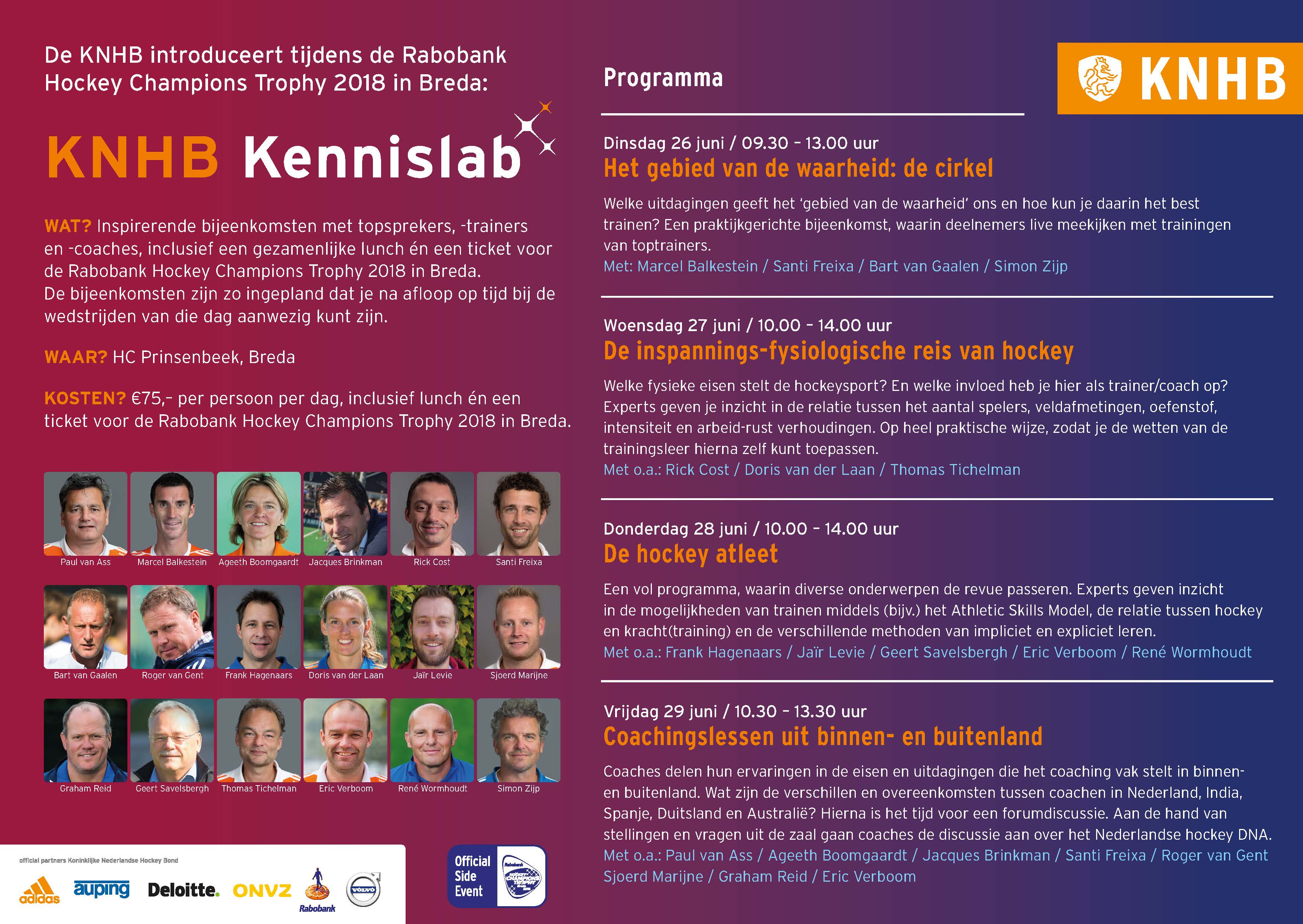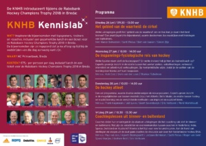 Tijdens de Rabobank Hockey Champions Trophy 2018 in Breda introduceren we het KNHB Kennislab. Van 26 t/m 29 juni kun je deelnemen aan inspirerende kennisbijeenkomsten met topsprekers, -coaches en -trainers. Boeiende presentaties, demotrainingen en/of workshops + een lunch én een ticket voor de Rabobank Hockey Champions Trophy 2018 in Breda.