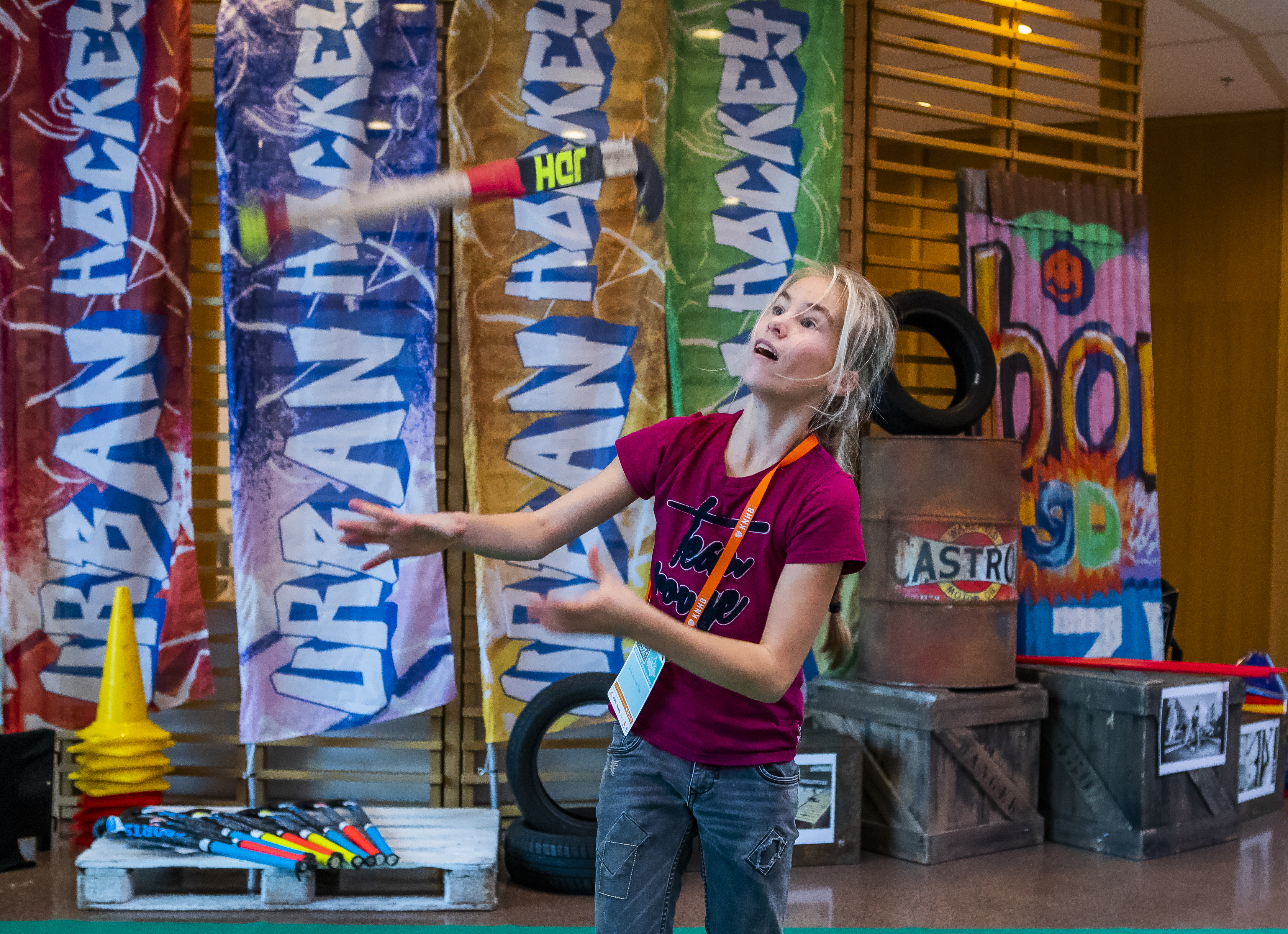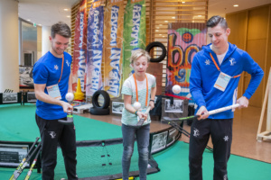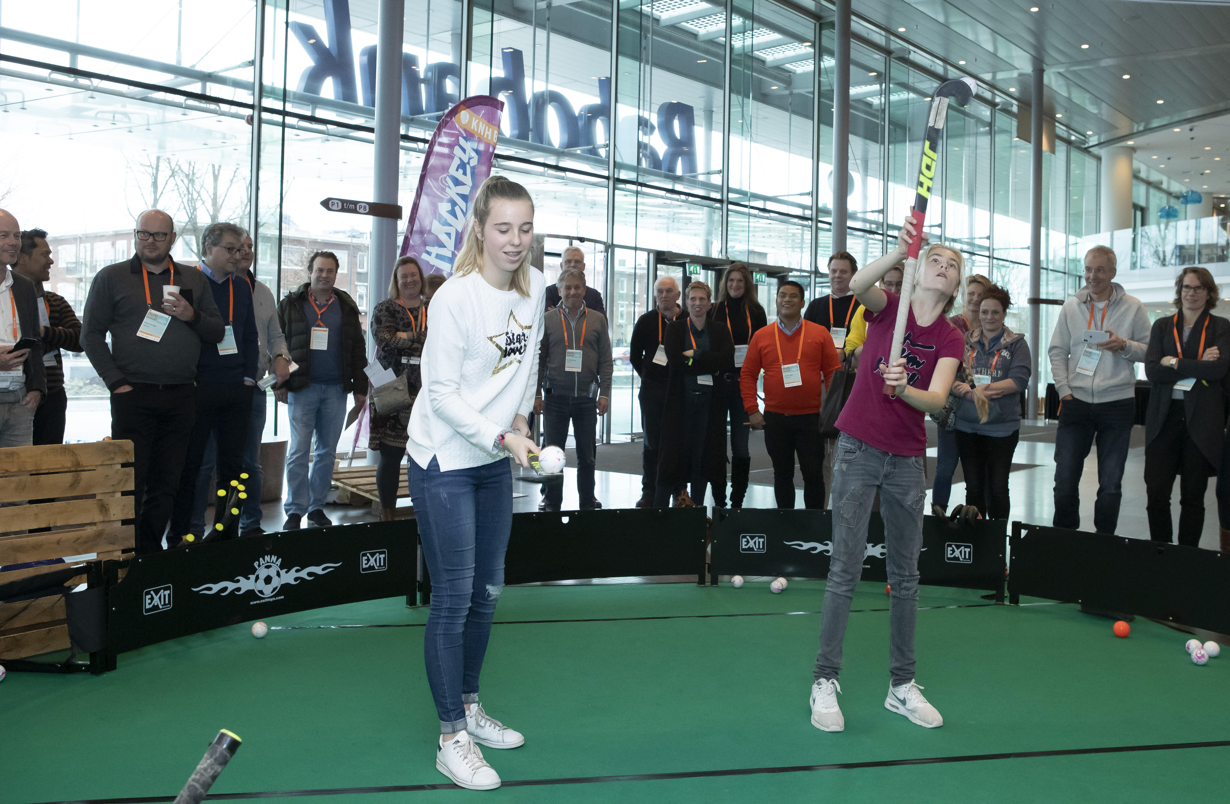 Tot slot werden de deelnemers uitgedaagd om iets nieuws te doen, namelijk het oefenen van hun Urban Hockey Skills. Hoogleraar Erik Scherder had eerder op de dag in het plenaire deel aangegeven wat het belang is van bewegen voor de ontwikkeling van het brein. Een aantal deelnemers ging de uitdaging aan!
