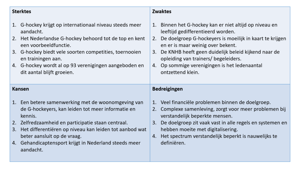 Dit zijn de sterktes, zwaktes, kansen en bedreigingen van het huidige G-hockey: