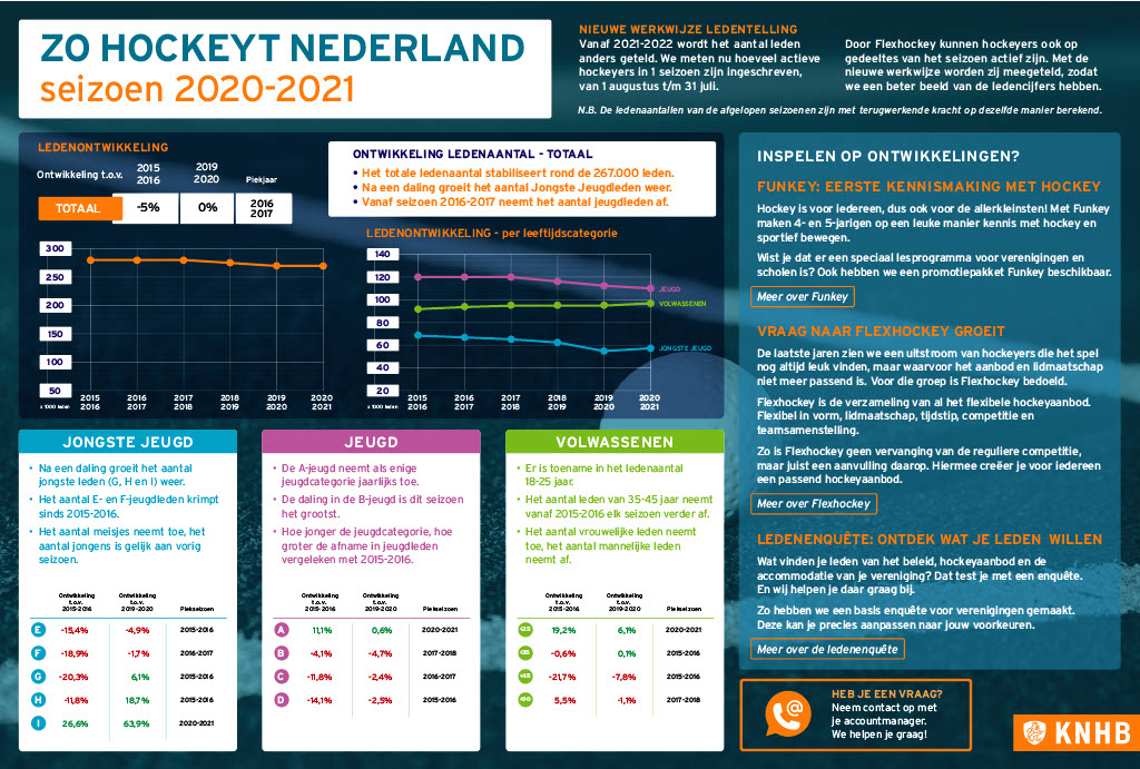 Elk jaar analyseren we het aantal hockeyende leden. Welke categorieën groeien, en welke krimpen? En wat zijn de ontwikkelingen?
