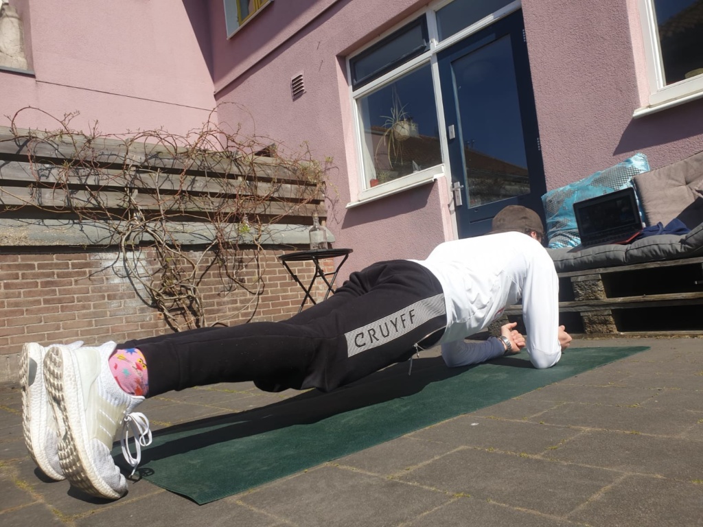 “De trainingen duren ongeveer 30 tot 45 minuten”, vervolgt Barendrecht. “De eerste vijf minuten zijn vaak inloop, waarin iedereen zichzelf voor de camera installeert en elkaar gedag zegt. Dan beginnen we met wat stabiliteit- en krachtoefeningen als warming-up, zoals bij een workout. Vervolgens doen we enkele hockey-technische vaardigheden en tot slot geef ik ze ook nog een opdracht mee. Bijvoorbeeld: ‘Wie maakt al hooghoudend het langste parcours door het huis heen’. Deze oefening kunnen ze dan eventueel wel ergens anders in huis of buiten doen.”