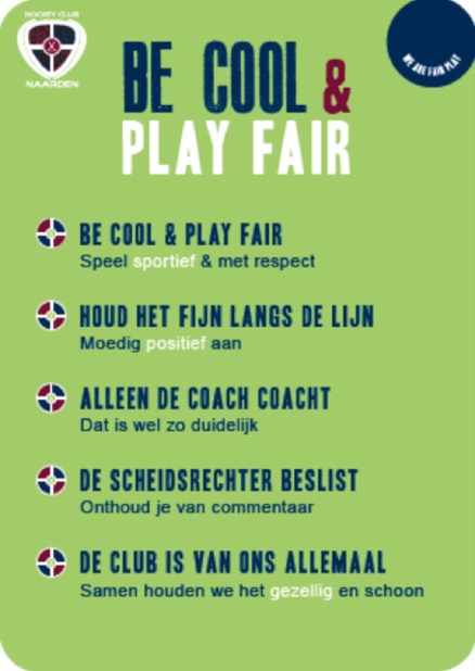 Na het aanpassen van de gedagscode volgde een vertaalslag naar 5 korte en krachtige regels (de zgn. gouden regels). Als je wilt dat het gaat leven, moet je het hanteerbaar en herkenbaar maken, niemand gaat immers ellenlange teksten lezen. Daarom is ook het aantal gouden regels tot 5 beperkt. Het overkoepelende motto is ‘Be Cool & Play Fair’. Het is overigens nadrukkelijk niet de bedoeling om met een opgeheven vingertje mensen terecht te wijzen. Betrokkenheid en emotie horen er nu eenmaal bij. Er is niets mis met willen winnen en fanatiek hockeyen of enthousiast aanmoedigen, maar je moet je wel bewust zijn van je rol en eigen gedrag.