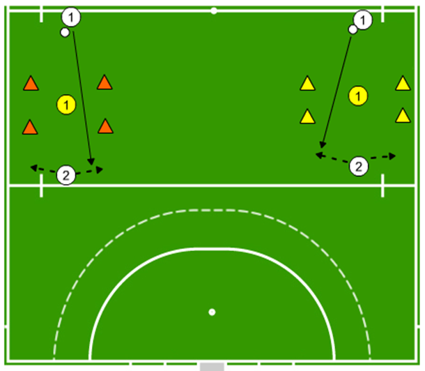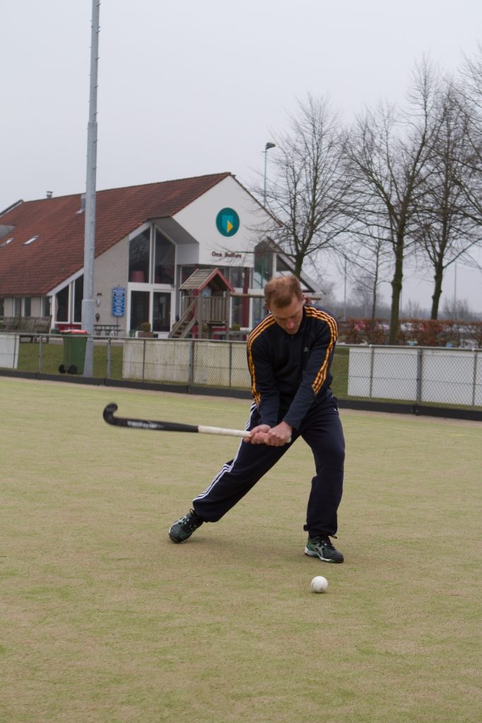 Doe nooit oefeningen met een stilliggende bal, want dat is lastig voor spelers. Geef de bal altijd een klein voortikje, gevolgd door een achterzwaai. Vervolgens gaat de stick naar het rollende raakpunt. Je stapt daarbij in met het linkerbeen (net zoals bij tennis). Na het raakmoment stap je door met de rechtervoet.