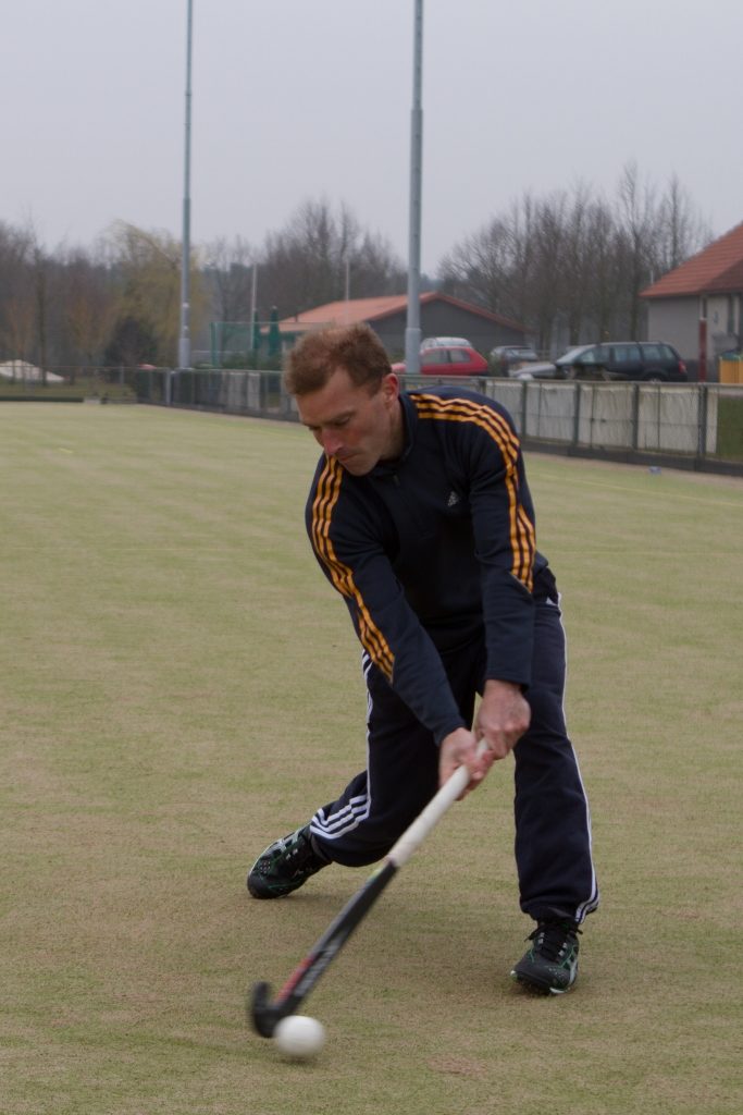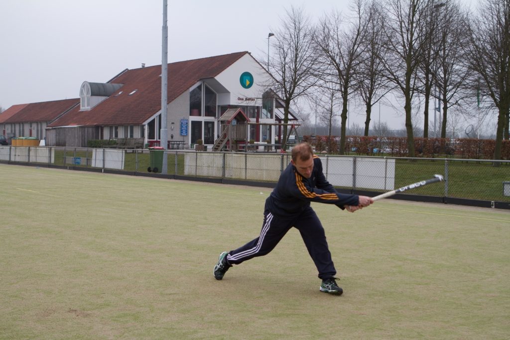 De stick eindigt in de doorzwaai onder de knie en wijst naar de heup van de partner met wie je oefent. Let bij de vier foto’s ook op de rechtervoet. Hieraan kun je zien dat er sprake is van gewichtsoverdracht. De speler zou eventueel met rechts door kunnen stappen.