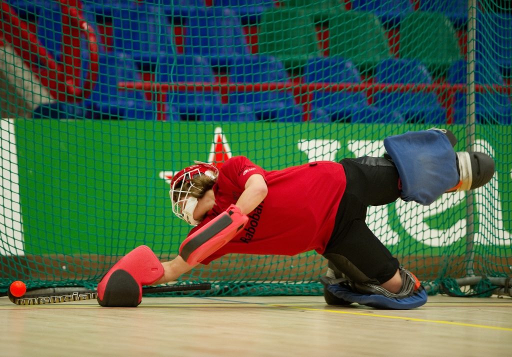 Een ander verschil met veldhockey is dat in de zaal een rebound niet hoog van je af mag komen. Dit vraagt om een iets andere techniek. Als je een bal stopt, druk je deze als het ware iets naar beneden – in plaats van dat je hem van je legguard of handschoen af laat kaatsen.