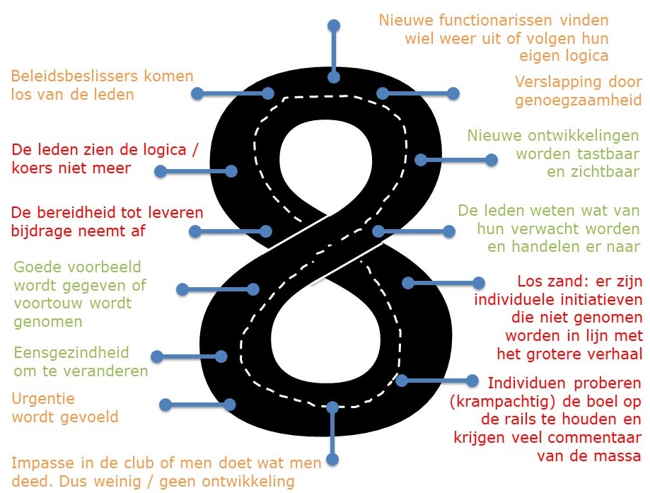 Ik durf, gezien de ervaringen, te stellen dat veel verenigingen niet goed in staat zijn zichzelf te innoveren, waardoor zij vroeg of laat weer uitkomen op een eerder vertrekpunt. Op basis van de terugkoppeling van mijn collega’s bij Back2Basics, waar wij regelmatig intervisies houden om elkaar beter te maken, heb ik geprobeerd de (natuurlijke) processen van de vereniging in kaart te brengen en het concreet gemaakt in een model: ‘De vereniging die een 8baan heet’ (figuur 1).
