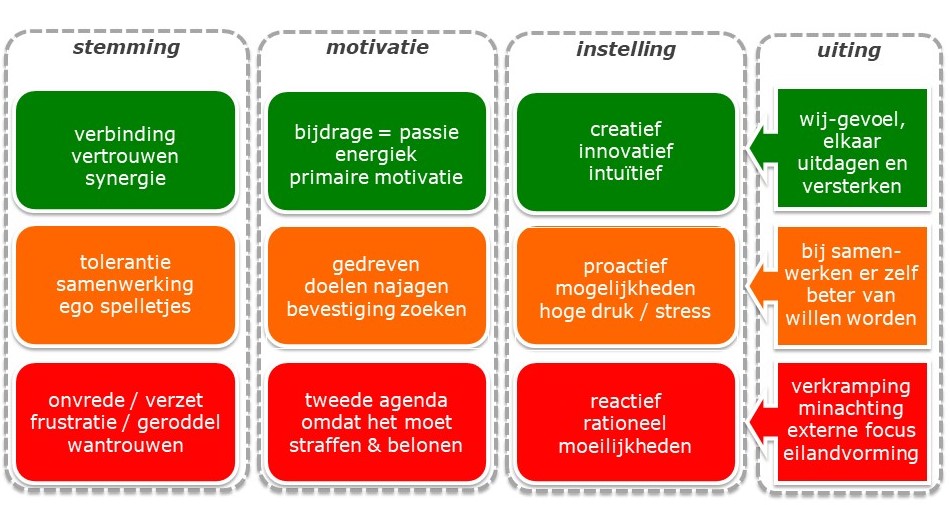 Ik ben er wel achter gekomen dat deze ‘harde’ kant – dat wil zeggen het inrichten van een organisatie – niet allesbepalend is. Want zoals eerder aangegeven, hebben beleidsplannen geen lang leven doordat men het bestaan er niet meer van kent of dat er toch weer, vaak om praktische redenen, van afgeweken wordt. Het is zeer gebruikelijk dat bij het aantreden van een nieuw bestuur de koers (radicaal) gewijzigd wordt. Vaak gebeurt dit zonder enige logica, waarbij de indruk ontstaat dat het nieuwe bestuur graag ergens haar stempel op wil drukken. Ik vermoed dat deze koerswijziging ook ontstaat omdat voor hen de gekozen koers niet altijd even helder is. Kennisoverdracht tussen de oude en nieuwe bestuursleden vindt nauwelijks plaats. Als ik aan oude bestuursleden, die aan hun opvolger aangegeven hebben dat ze altijd bereikbaar zijn voor vragen, vraag hoe vaak er contact met ze is opgenomen, dan is dat meestal nul keer. Als ze al benaderd worden, dan is het meestal om iets praktisch. En als de overdracht wel goed verloopt, dan zie je dat vaak het derde bestuur in de rij van opvolging alsnog van de plannen gaat afwijken omdat zij onvoldoende de oorsprong en bedoeling van de plannen kent.