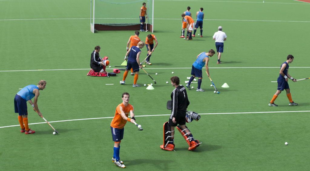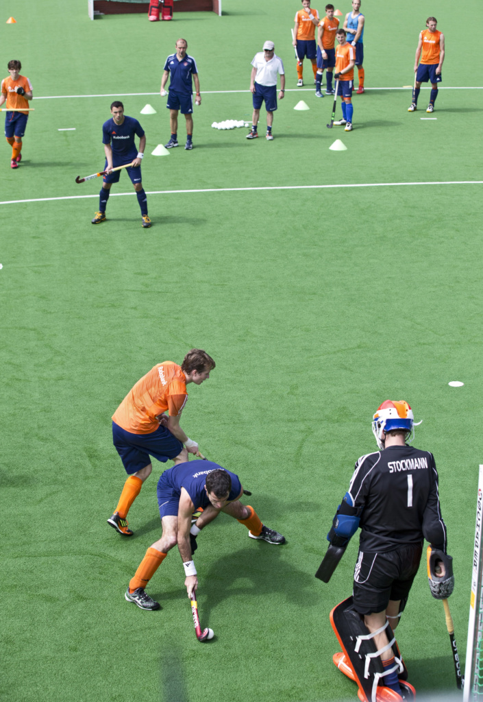 Om het lichaam optimaal in de submaximale hartslagzone te trainen, is het van belang te weten hoeveel minuten een speler in deze zone per wedstrijd speelt. Cost: “Bij het nationale team speelt men rond de 50-55 minuten per wedstrijd. Ik heb helaas geen gegevens voor clubteams van de overgangsklasse en lager. In de hoofdklasse is het aantal speelminuten afhankelijk van de gekozen wisselstrategie. Steeds meer clubs kiezen er voor om meer door te wisselen, bijvoorbeeld volgens een wisselschema, om de vermoeidheid van spelers te controleren en meer vermogen te kunnen blijven leveren op het veld. Dit kan een coach uitzoeken door een paar spelers een aantal wedstrijden te voorzien van een hartslagband. Als stelregel kun je aanhouden dat je als clubspeler, die twee tot drie keer per week traint, tussen de 20 en 30 minuten van een training van 90 minuten op dit (wedstrijd) niveau traint. Deze ondergrens van 85 – 92% van de HFmax is een wetenschappelijke uitkomst om de wedstrijd zo goed mogelijk te simuleren en dus te kunnen adapteren naar het vermogen dat gevraagd wordt tijdens de wedstrijd. En belangrijker: om het vermogen gedurende de tijd dat een speler in het veld staat te behouden.”