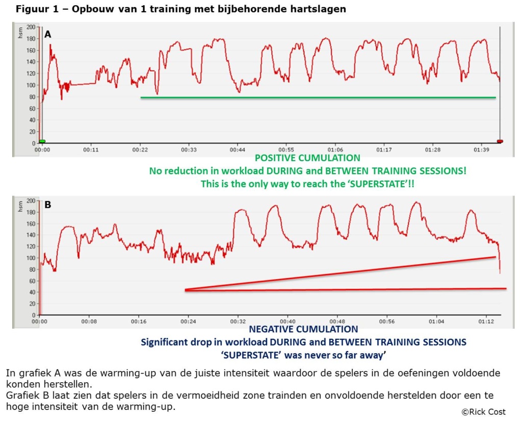 Cost vervolgt: “Mijn advies zou zijn: zorg voor een warming-up waarin de spelers ‘ready to train’ zijn. Maar al te vaak zie ik een warming-up die geen inhoud heeft: even een rondje om het veld, wat rekken aan het hek en wat overspelen. Op deze manier is je lichaam niet klaar voor submaximale inspanningen (het gewenste hartslagniveau wordt zo niet gehaald) met alle gevolgen van dien. Daarom adviseer ik om na het warmlopen een scherpe balbezit van 4 minuten in te bouwen.”