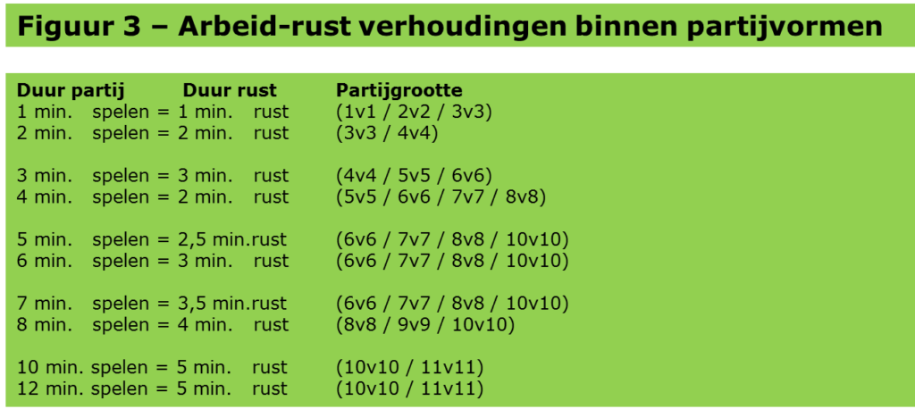 Net als in de reguliere training is het van belang dat de spelers tijdens de warming-up de submaximale hartslag bereiken (85-92% van de HFmax). Even een balletje overslaan en wat heen en weer dribbelen is dus niet voldoende om het lichaam ‘ready to go’ te maken. Ook hier geldt dat een lange warming-up niet vanzelf een goede warming-up is. Lukt het je als coach om de juiste waardes te bereiken? Dat is de hamvraag. Laat de spelers eerst wat inlopen en eindig dit blok met een aantal versnellingen. Daardoor gaat de hartslag naar submaximaal. Als je daarna balbezit speelt, zorg dan voor goede veldverhoudingen. Vaak zijn de afstanden te klein. Daardoor staan de spelers teveel stil, waardoor de hartslag weer naar de ruststand gaat. “Houdt rekening bij een 4 tegen 4 of 5 tegen 5 met 40-60m2 speelruimte per speler. Dus bij een 5 tegen 5 is het speelveld tussen de 400 en 600m2. En voorkom dat er tussen einde warming-up en start wedstrijd meer dan 10 minuten zit. Want dan keert je lichaam weer terug naar de ruststand en kun je weer opnieuw beginnen. Let op: je wilt geen vermoeidheid creëren, maar de hartslag moet wel omhoog (zone 170 slagen per minuut of 85-92% van de HFmax)!”, aldus Cost.