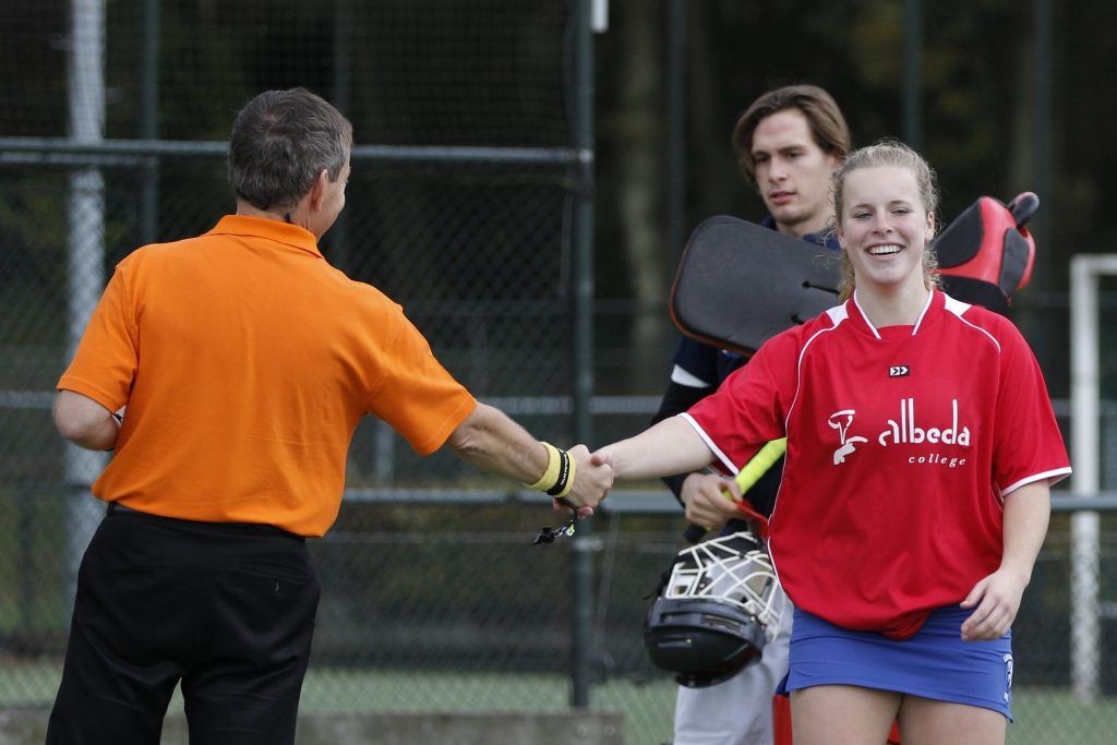 Het bedanken van de scheidsrechter die de veiligheid in alle opzichten heeft gewaarborgd. (foto: KNHB/Willem Vernes)