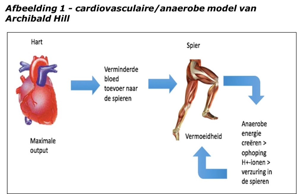 In 1923 heeft fysioloog Archibald Vivan Hill zijn cardiovasculaire/anaerobe model geïntroduceerd (Hill, 1923). Dit model legt vanuit een fysiologisch perspectief uit hoe vermoeidheid tijdens het sporten ontstaat. Hill legt uit dat het uithoudingsvermogen van een sporter volledig afhankelijk is van de capaciteit van het hart om zuurstof naar de spieren te sturen (Noakes, 2012; Abbiss, 2005). Energie kan worden gecreëerd door de verbranding van glucose met of zonder zuurstof, dus middels aerobe of anaerobe verbranding. Op het moment dat het hart de spieren van genoeg zuurstof kan voorzien, wordt energie met zuurstof gecreëerd (aerobe verbranding). Op een bepaald moment tijdens inspanning, hebben de spieren meer zuurstof nodig dan het hart kan rondpompen. Het hart zit op zijn maximale inspanning. Als spieren niet genoeg zuurstof krijgen om energie te maken, wordt er energie gemaakt zonder zuurstof (anaerobe verbranding).