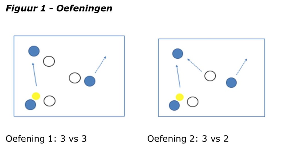 Wanneer spelers cognitief vermoeid zijn, is het belangrijk focus te behouden. Dit kan geoefend worden door de spelers een positiespel te laten spelen met twee aanpassingen. Geef deze oefening tegen het einde van de training, verklein het veld en speel 3 versus 3 (figuur 1 – oefening 1). Door het veld te verkleinen, gaat de handelingssnelheid omhoog. Daardoor zullen de spelers sneller beslissingen moeten nemen, hetgeen extra vraagt van het brein. Zeker als de spelers al fysiek moe zijn, is dat een extra trainingsbelasting. De handelingssnelheid kun je nog verder verhogen door een overtal te creëren door 3 versus 2 te spelen (figuur 1 – oefening 2). Leg het spel af en toe stil en bespreek met de spelers wat er goed gaat en wat er beter kan. Het is belangrijk om deze oefening vaker te laten terugkomen tijdens de trainingen. Daardoor leren spelers omgaan met vermoeidheid en kunnen ze hun focus trainen onder deze toestand.