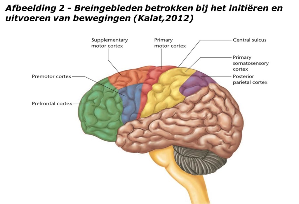 De hersenen zijn opgedeeld in verschillende gebieden, ook wel kwabben genoemd, die elk een eigen soort specialisatie hebben. Zo heb je in het brein ook een bepaald gebied dat wordt geactiveerd wanneer bewegingen worden geïnitieerd of uitgevoerd. Dit wordt ook wel de motor cortex genoemd. Deze motor cortex heeft verschillende gebieden die elk een andere rol spelen bij het initiëren en uitvoeren van een beweging. De belangrijkste gebieden zijn de premotor cortex, supplementaire cortex en primaire motor cortex (afbeelding 2). Daarnaast speelt de somatosensorische cortex ook een belangrijke rol. Deze ligt achter de centrale sulcus en hoort niet meer bij de motor cortex. De somatosensorische cortex ligt wel naast de motor cortex. Het brein is zo ‘ontworpen’ dat de gebieden die het meest met elkaar moeten samenwerken ook naast elkaar liggen. Op deze manier is communicatie makkelijk en snel.