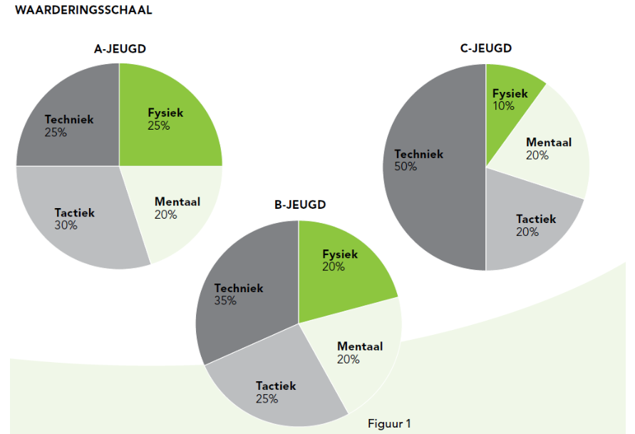 Op deze manier creëer je een totaalplaatje. Bovendien is het een goede toets of er in dat jaar gestructureerd getraind is. Ook kun je toetsen of de trainer heeft gewerkt aan de onderdelen die voor dat leerjaar van belang zijn. Dat brengt ons meteen op het volgende onderdeel. Welke waarde moet je hechten aan de uitkomsten van de testen? “Deze uitkomsten mogen nooit leidend zijn”, vindt Smolenaars. “Ze ondersteunen de eerdere bevindingen. Het is daarbij van groot belang om per categorie de belangrijkheid van de onderdelen te bepalen. Zo kun je tot een goed gewogen oordeel komen.”