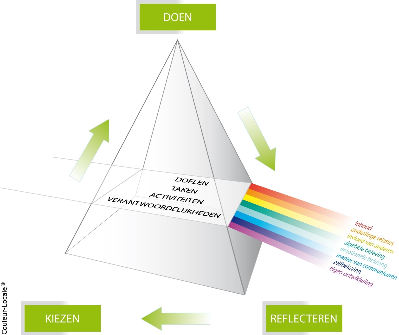 De Spectrum Energiemeting® is in zekere zin al een reflectie op de actuele stand van zaken. Maar ook allerlei andere momenten lenen zich voor reflecties: de wedstrijdbespreking, korte momenten in de rust en op de reservebank, conflictgesprekken, et cetera.. De 35 woorden die in het kader ‘Spectrum Energiemeting®’ staan, worden niet alleen ingezet voor de meting, maar ook voor de reflectie. De reflectie zet aan tot beweging. Sterker nog, de reflectie eindigt met concrete keuzes om tot actie over te gaan: wat gaat goed en willen we zo houden en waar wordt energie verloren en gaan we aanpakken? En direct daarna: en hoe gaan we dat doen?