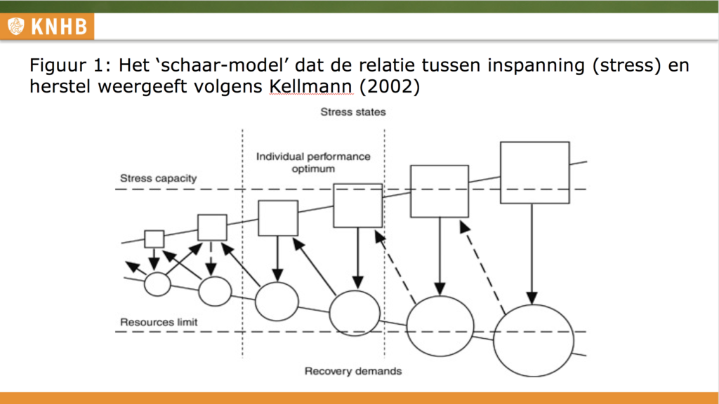 Onvoldoende herstel zorgt ervoor dat een sporter meer inspanning moet leveren wanneer hij wordt geconfronteerd met een nieuwe trainingsprikkel. Dit wordt weergegeven in Kellmann’s (2002) ‘schaar-model’ (figuur 1). Daarin wordt gesteld dat een sporter een zekere inspanning aan kan zonder behoefte aan extra compensatie door herstel-activiteiten. Dit gaat goed totdat de belasting zodanig toeneemt, en daarmee de behoefte aan herstel, dat er een disbalans ontstaat tussen inspanning en herstel. De paradox is hier dat een toename van de belasting vaak gepaard gaat met minder energie voor herstel. Met andere woorden: hoe groter de behoefte aan herstel, hoe vermoeider de sporter is, hoe minder energie er vervolgens over is om de batterijen op te laden. De batterijen zijn inmiddels al (te) leeg. Zo kan een cumulatief proces op gang komen, waarbij het psychofysiologische systeem (hartslag, bloeddruk, ademhaling, adrenaline) de grens steeds verder moet verleggen om iedere keer de vereiste inspanning te kunnen leveren. Deze aanpassing wordt ook wel allostatische regulatie genoemd (McEwen,1998). Het is hierbij van belang om te realiseren dat herstel lang kan duren. Onderzoek heeft laten zien dat de psychofysiologische stress van professionele rugbyers 36 uur na een wedstrijd nog verhoogd was (Lindsay et al., 2015).