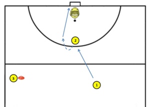 Speler 1 speelt de bal in op speler 2. Speler 2 dient altijd rechts uit te draaien en af te werken. Op het moment dat de bal gespeeld wordt steekt speler 3 willekeurig de pylon wel of niet in de lucht. Steekt hij de pylon in de lucht dient speler 2 de andere kant uit te draaien, linksom dus.