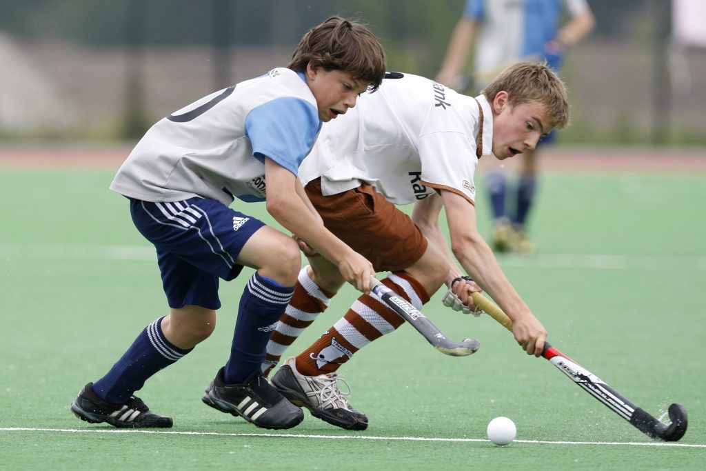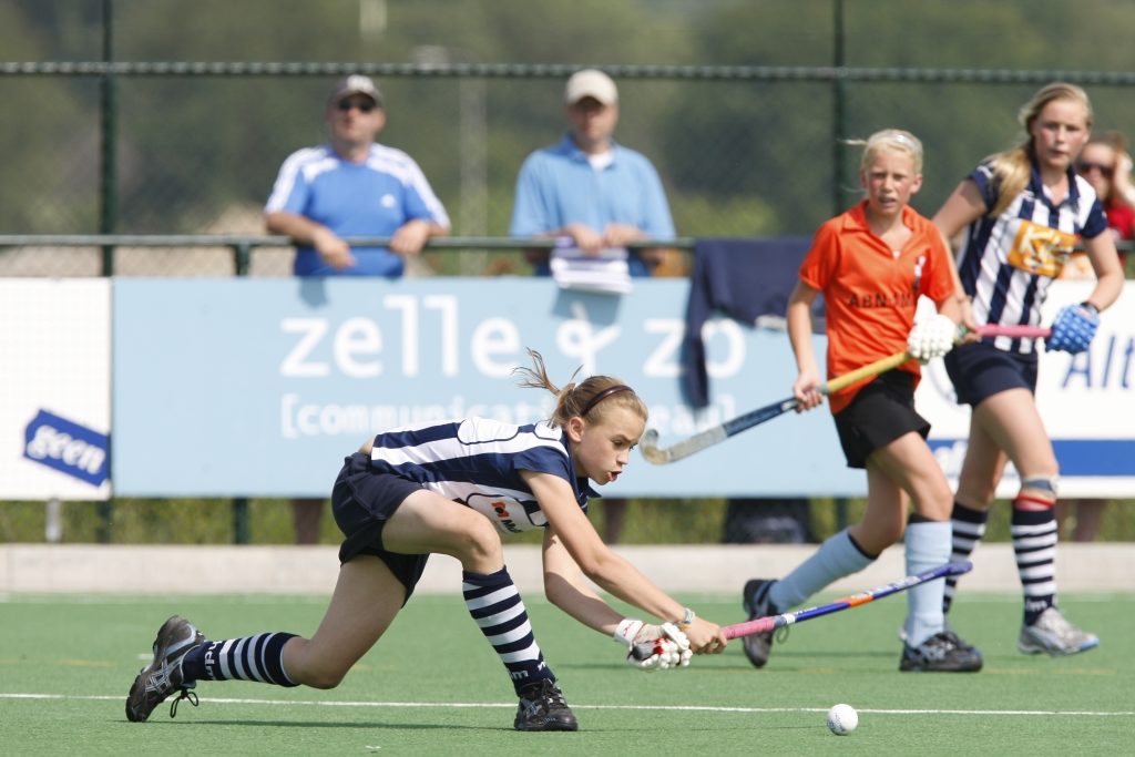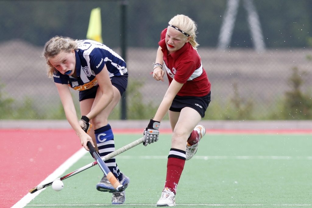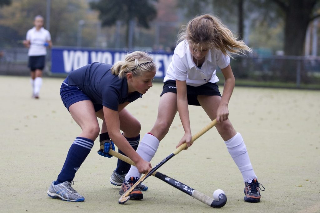 In de wedstrijd en ook in de training zien we voortdurend de strijd om de bal. (foto: KNHB/Willem Vernes)