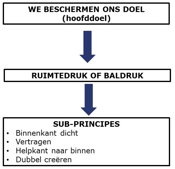 Dat grote, alles overkoepelende, principe (geen tegengoal krijgen) kan op vele manieren uitgevoerd worden. Als eerste grove schifting maak ik hier onderscheid in het geven van ruimtedruk of baldruk.