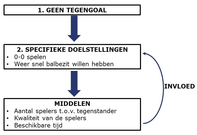 Deze middelen bepalen heel nadrukkelijk je mogelijkheden en hebben daarmee meteen invloed op jouw doel. Wil je 1-op-1 spelen om er nog wat uit te slepen, maar hebben jouw spelers weinig snelheid en niet de kwaliteit om goed duels aan te lopen? Dan moet je jouw doelstelling al snel bijstellen, want jouw middelen bepalen dan voor een deel jouw doel.