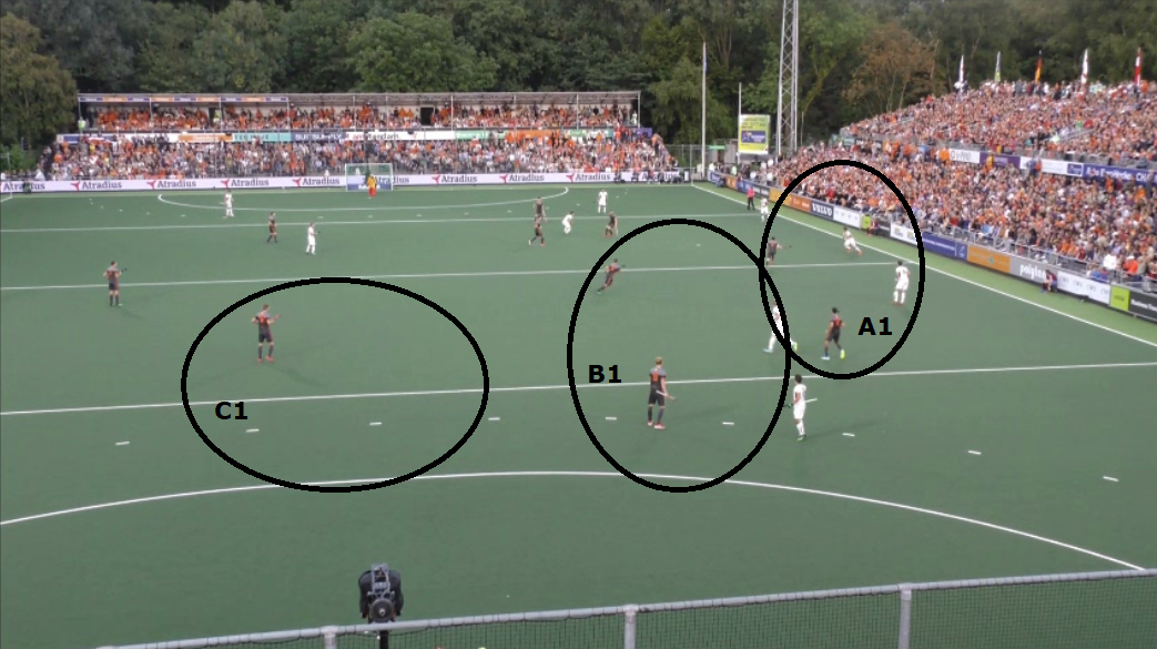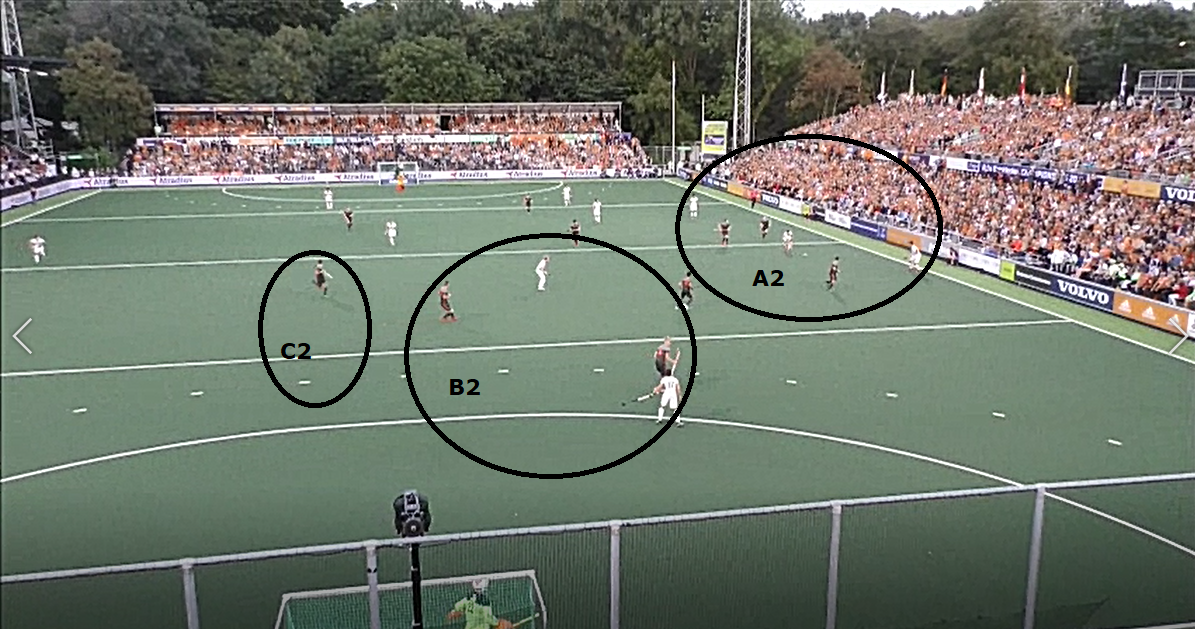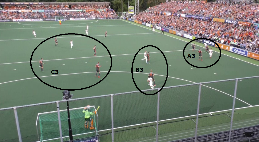 A3: geslaagde baldruk; bal wordt terug gedrukt richting eigen helft tegenstander, mede door omkeerdruk van spitsen NL