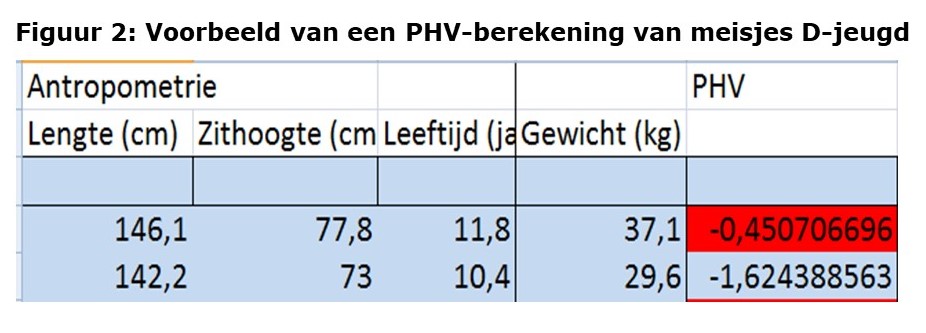 Deze gegevens kunnen hier ingevuld worden. Hiermee kan de leeftijd worden berekend op basis waarvan waarschijnlijk de groeispurt plaatsvindt en kunnen trainingsprogramma’s daarop worden aangepast. Ondanks de beperkingen van deze methodiek is het de meest praktische manier om inzicht te krijgen waar een speler staat in zijn groeiontwikkeling. Dit inzicht kan vervolgens gekoppeld worden aan de reguliere timing van de groeispurt bij jongens (ongeveer 14 jaar) en meisjes (ongeveer 12 jaar).
