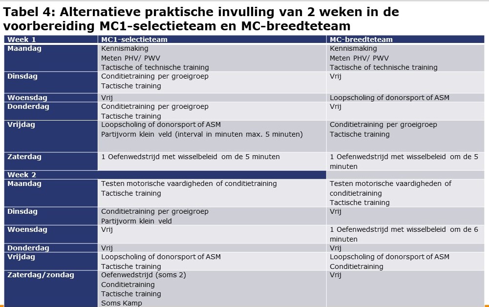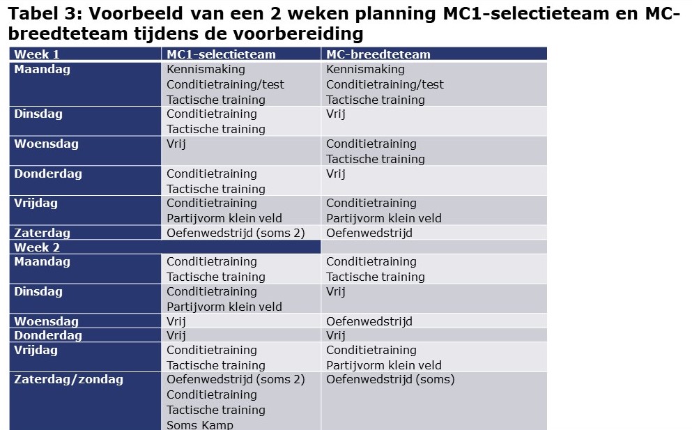 Bij de start van het seizoen van een Meisjes C-selectieteam wordt in de vierde week van de zomervakantie weer gestart met voorbereiding op het nieuwe seizoen. Normaal gesproken traint dit team 3x per week, maar vanwege de vakantie is dit 5x per week. De planning (tabel 3) voor de twee weken in de vakantie is als volgt (het is een ruwe planning zonder invulling van tijd, dit verschilt nogal per sport en vereniging):