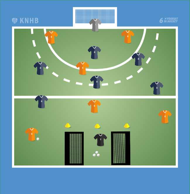 Maak een veld zoals op de tekening met twee goals om op te scoren, wijzend naar de zijlijn. Maak twee teams.