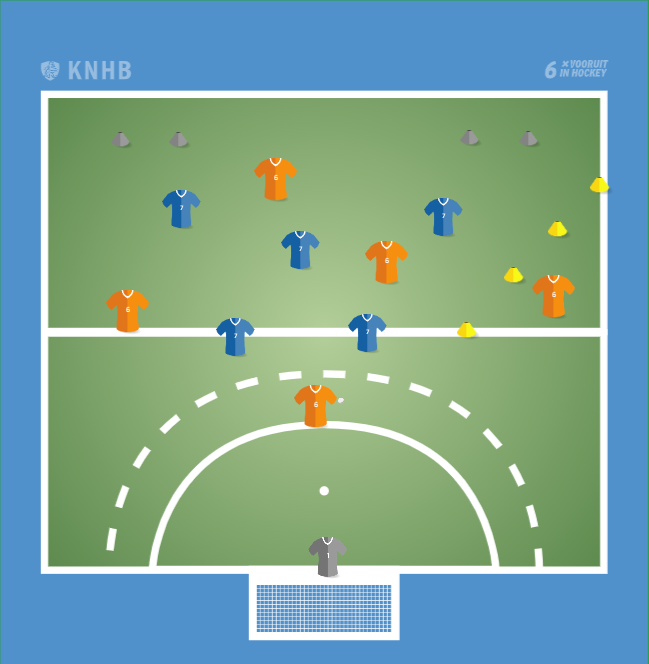 Maak een veld zoals op de afbeelding. Oranje speelt met keeper tegen blauw.
