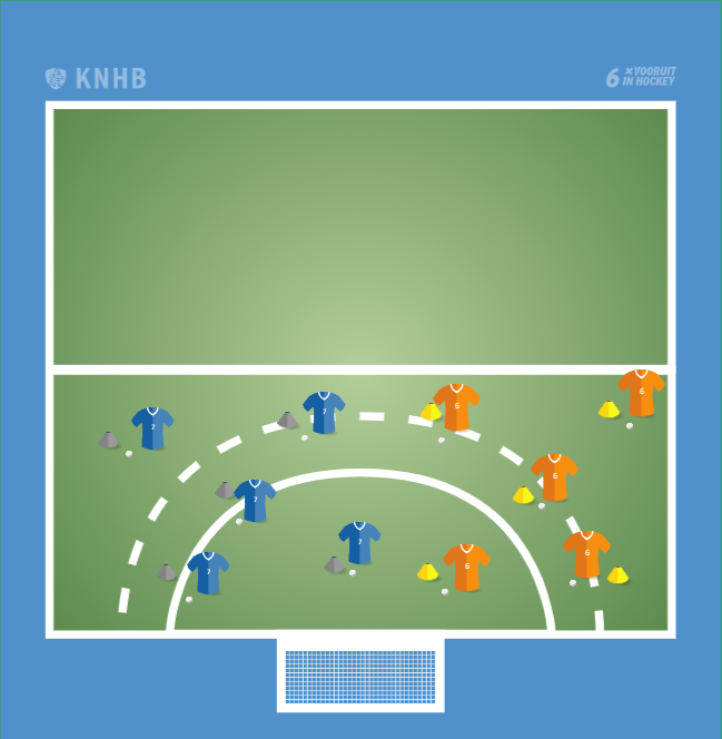 Oranje speelt tegen blauw. Iedere speler heeft 1 bal en 1 hoedje.