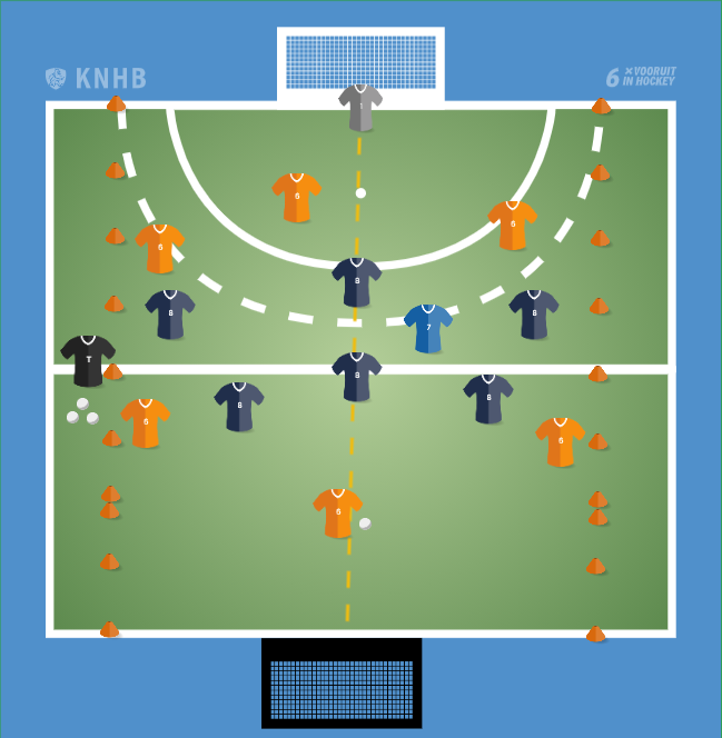 Maak een veld zoals op de tekening. Maak een zijlijn met op de kruising achterlijn stippellijn. Maak twee teams en wijs één joker aan.