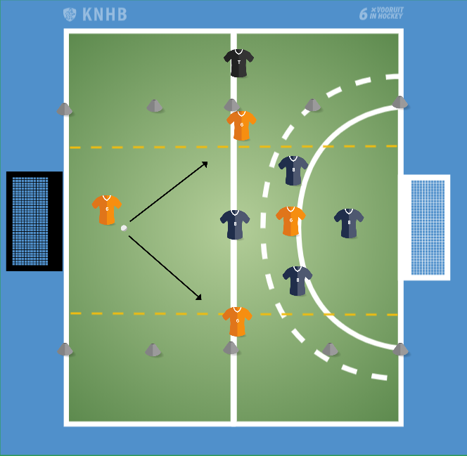 Maak een veld van ongeveer 30 meter lang en 23 meter breed (let op: de afmetingen in de afbeelding kloppen niet). Leg 2 tramrails banen van hoedjes (of flapjes als je die hebt) aan beide zijkanten van het veld over de hele lengte. Maak 2 teams.