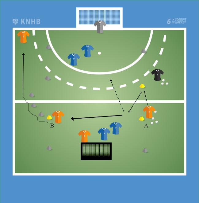 • Oranje drijft bij A op met de bal en vervolgt deze actie met een richtingsverandering met de backhand. Daarna passt hij de bal naar de helpkant (B).
