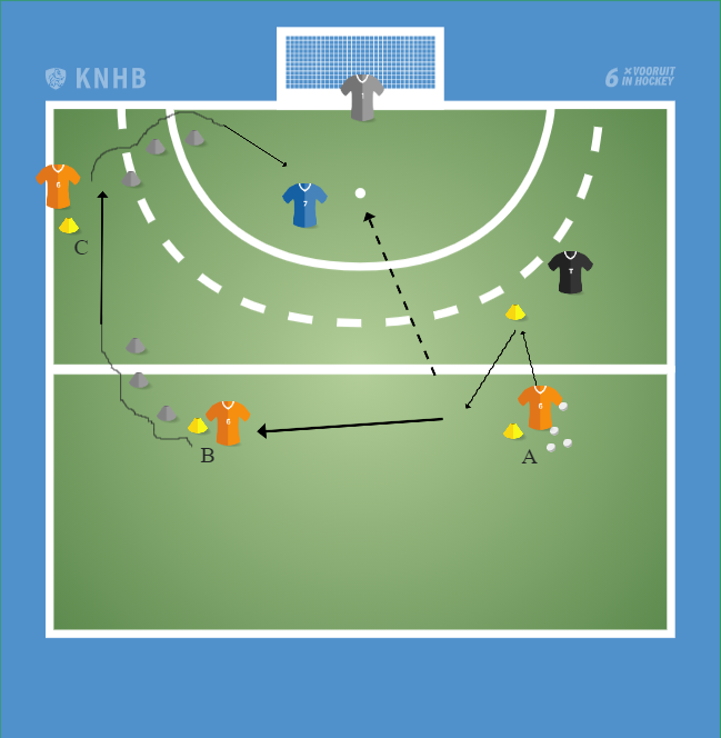 Maak een veld zoals op de tekening. Wijs drie verdedigers aan. Eén verdediger staat in de cirkel.