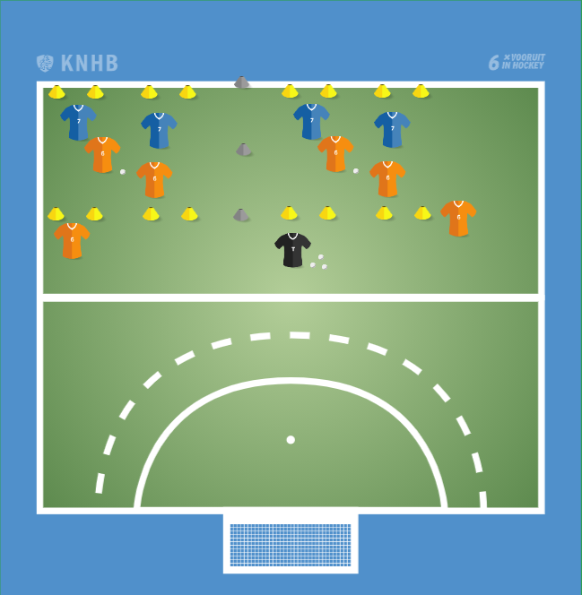 Maak 2 veldjes waar teams 2 tegen 2 spelen. Beide teams hebben 2 goaltjes.