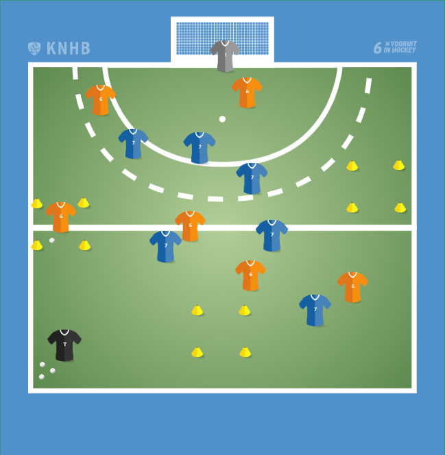 Maak een veld met drie vakken, zoals op de tekening. Maak twee teams. Oranje begint met de bal in het linker vak.