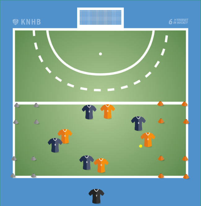 Maak een veld met in alle hoeken een vierkant. Oranje verdedigt de oranje vierkanten, blauw verdedigt de grijze vierkanten.