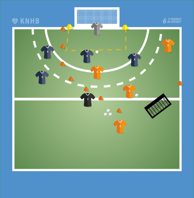 Maak een veld zoals op de afbeelding. Zet op 3 meter aan beide kanten van de goal 2 hoedjes. Dit is de 'bucket'. 2 verdedigers starten in de cirkel. 1 aanvaller start bij de bal.